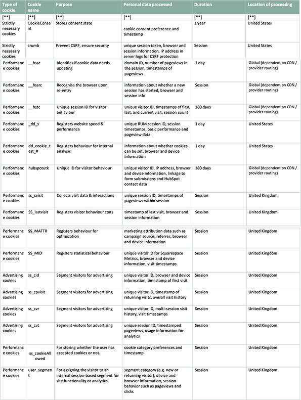 Performance cookies – These cookies are used by us to analyse the performance and design of the Website and to detect any potential errors or malfunctions. They also enable us to recognise previous visits to our Website, which parts of the Website visitors visit most frequently, and how much time visitors spend on the Website. The purpose of these cookies is to improve the performance of the Website by understanding how visitors interact with it.